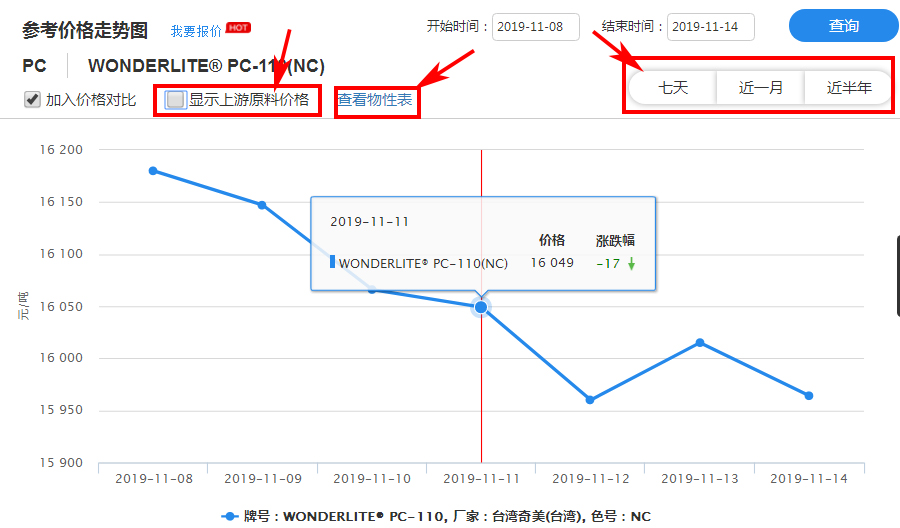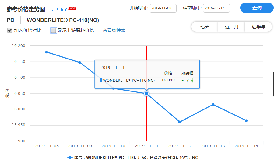 例如:搜索塑料牌號為WONDERLITE® PC-110(NC)塑料原料。即可出現價格走勢圖,清楚顯示該塑料的實時價格與跌幅和漲幅對比。