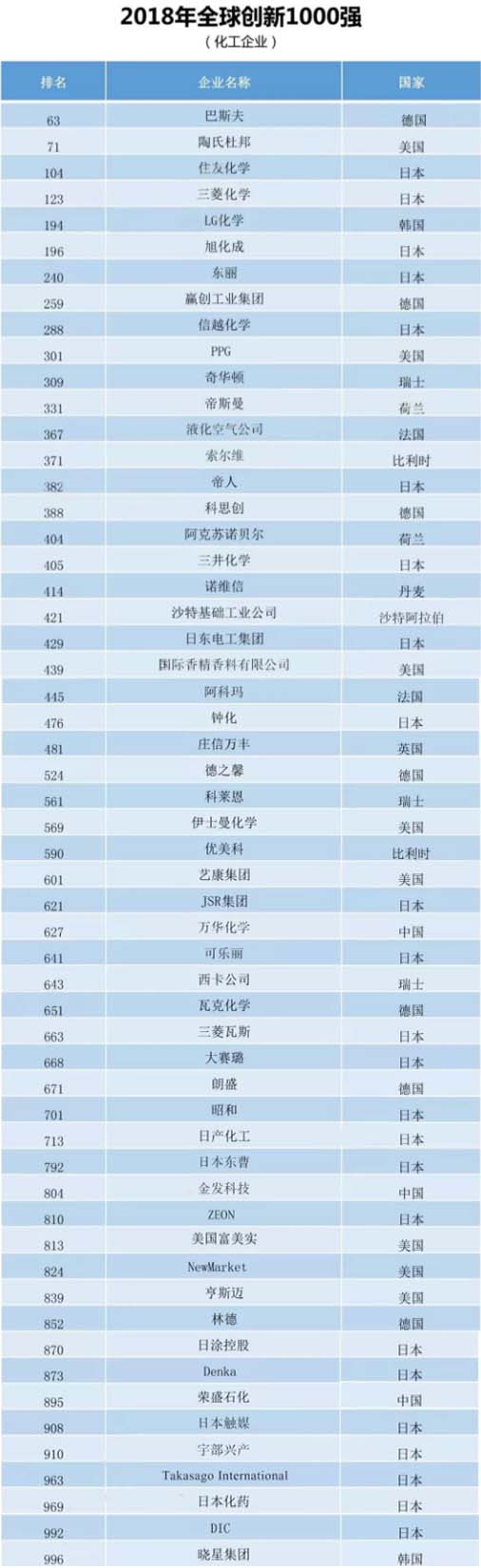 中國有三家化工企業(yè)入圍,分別是:萬華化學(xué)(627)、金發(fā)科技(804)和榮盛石化(895)。