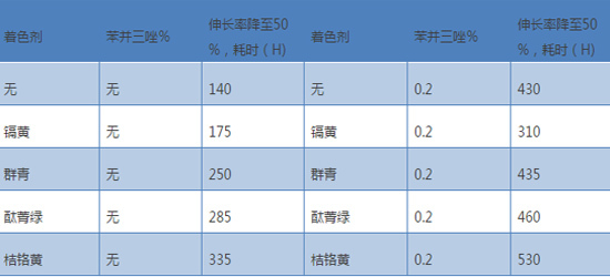 表 2不同著色劑對含苯并三唑的高壓聚乙烯薄膜的光穩定性的影響
