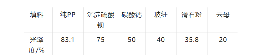 以PP填充為例,不同填料PP制品的光澤度如下表所示。值得一提的是同一種材料,粒度越小對光澤度的影響也就越小,也就是越細越亮。
