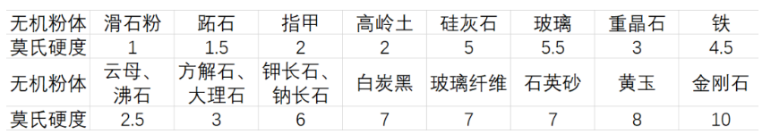 各類常見無機粉體材料的硬度