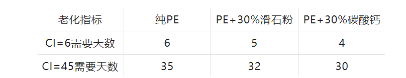 所有無機粉體材料都會加速復合材料的老化,下表為滑石粉和碳酸鈣對PE薄膜老化性能的影響。