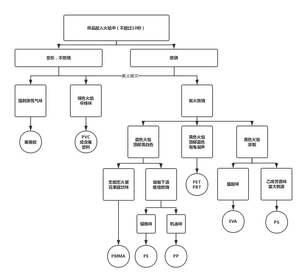 燃燒鑒別是比較流行的方法,它是利用小火燃燒塑料試樣,觀察塑料在火中和火外時的燃燒性,同時注意熄火后,熔融塑料的落滴形式及氣味來鑒別塑料種類的方法。
