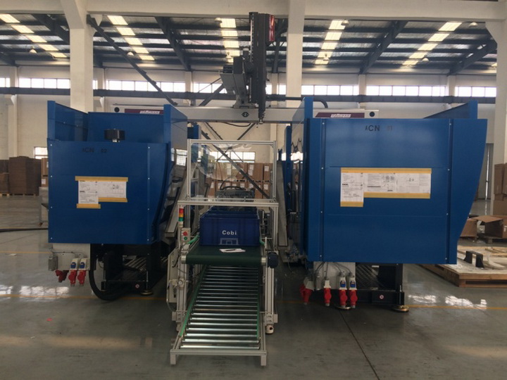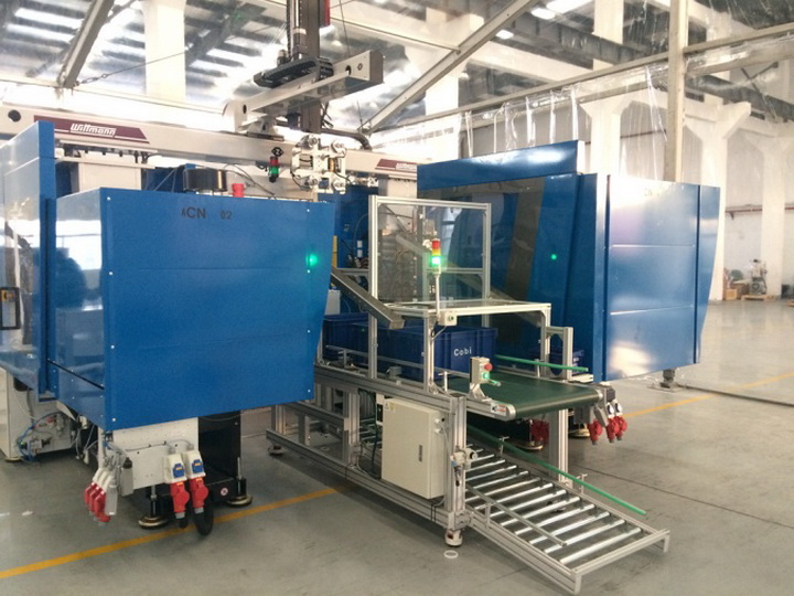 成型油箱閥門蓋的完整自動化系統,包括兩臺注塑機及一臺威猛CW838T機械手和一臺威猛全自動換箱設備
