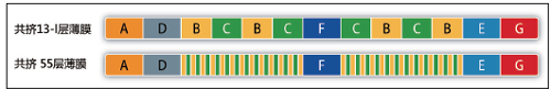 圖16 共擠13和55層薄膜的層構造:擠塑機A、D~G,各層薄厚占總薄厚的10%,擠塑機B和C,各層薄厚占25%(來源于:Polifilm)