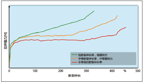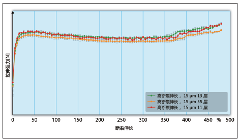 圖7 15μm厚的11層、十三層和55層的高延伸率薄膜的拉申力 - 延伸率圖(來源于:Polifilm)