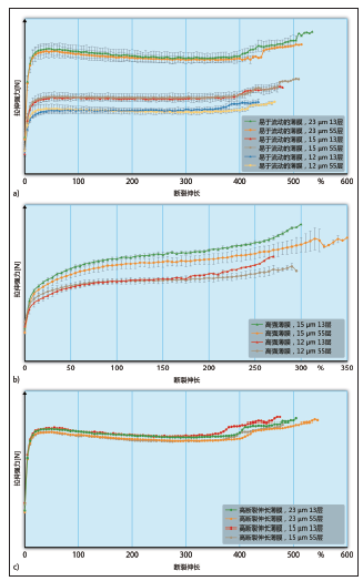 圖6 十三層和55層薄膜的拉申超強力-破裂伸展圖。a) 薄厚為12、15、23μm的易流動性薄膜;b)12、15 μm的高強度薄膜;c)高破裂伸展薄膜,薄厚15、 23 μm (來源于:Polifilm)