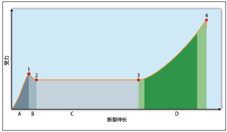 圖2 收縮膜的伸展主要表現,關鍵伸長區(A)、峰點(C)和工作區域(D)(來源于:Polifilm)