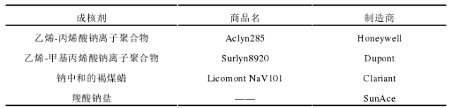 有機化學類成核劑主要是一元梭酸的Na、Li、Ba、Mg、Ca鹽,安息香酸的Na、K、Ca鹽,脂環甲基磺酸鹽、甲基對硫磷化學物質的Mg、Zn鹽,在其中實際效果不錯的是羧基醋酸鹽和羧基無機鹽。比如,含鉀離子的高聚物被覺得是PET工業生產上最有效的成核劑,在其中商業化的的PET成核劑以下表所顯示。