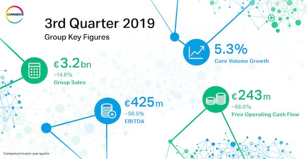 在2019年第三季度,科思創表示“在持續充滿挑戰的經濟環境中”,核心銷量較上年同期增長了5.3%。但在過去三個月中,該集團銷售額下降了14.6%,至32億歐元,這與科思創的預期一樣。