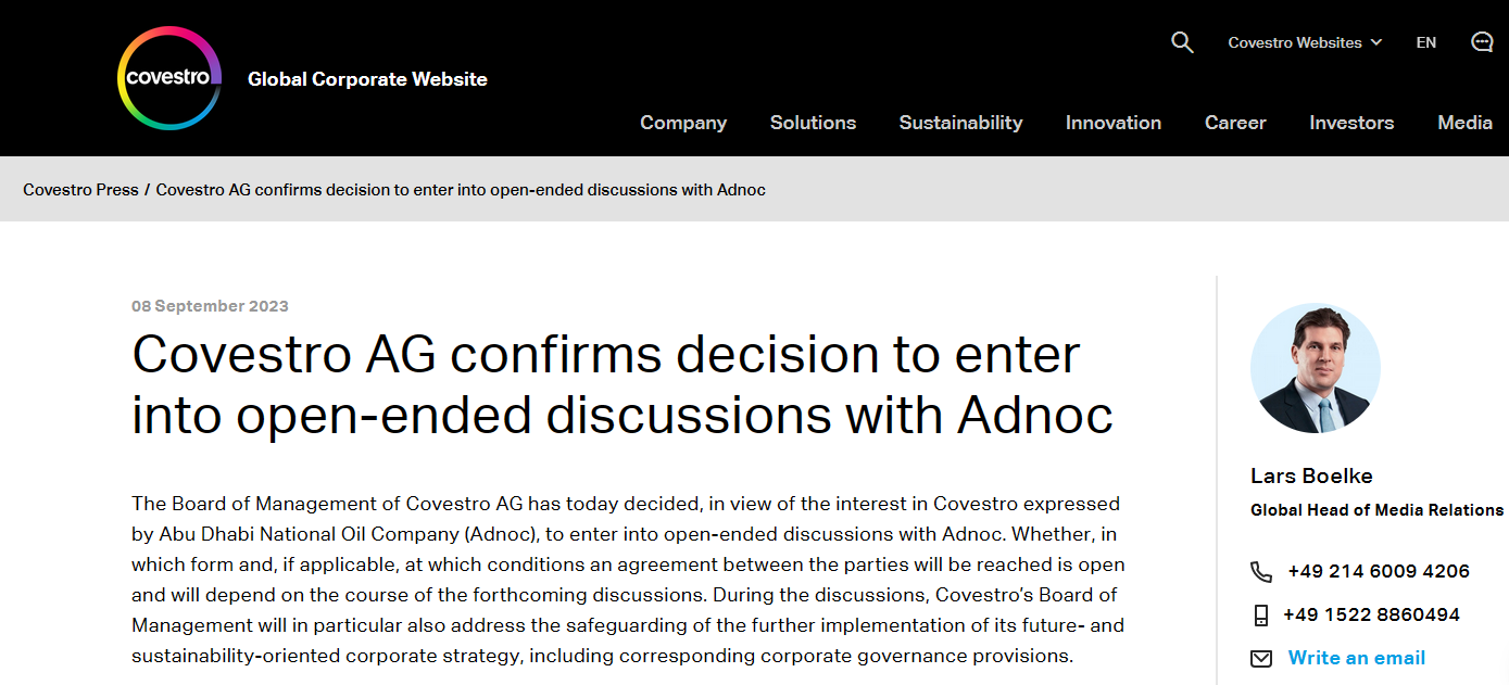鑒于阿布扎比國家石油公司(ADNOC)對科思創的興趣,科思創管理委員會決定與ADNOC進行開放式討論,但針對雙方之間的討論形式及討論條件尚未有定論與確定方案,這將取決于討論的進程。