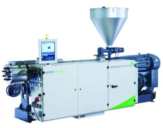 展位上另一臺展覽的機器設備是twinEX 93-28D雙螺桿擠出機,可用以管件、鋁型材及其PVC塑膠板材擠出生產制造。近些年,塑膠鋁型材銷售市場朝著環境保護、環保節能的方位發展趨勢,對高效率節能環保產品要求也日益升高。依據運用不一樣,擠出機生產量范疇從115KG/小時到2,500KG/鐘頭。