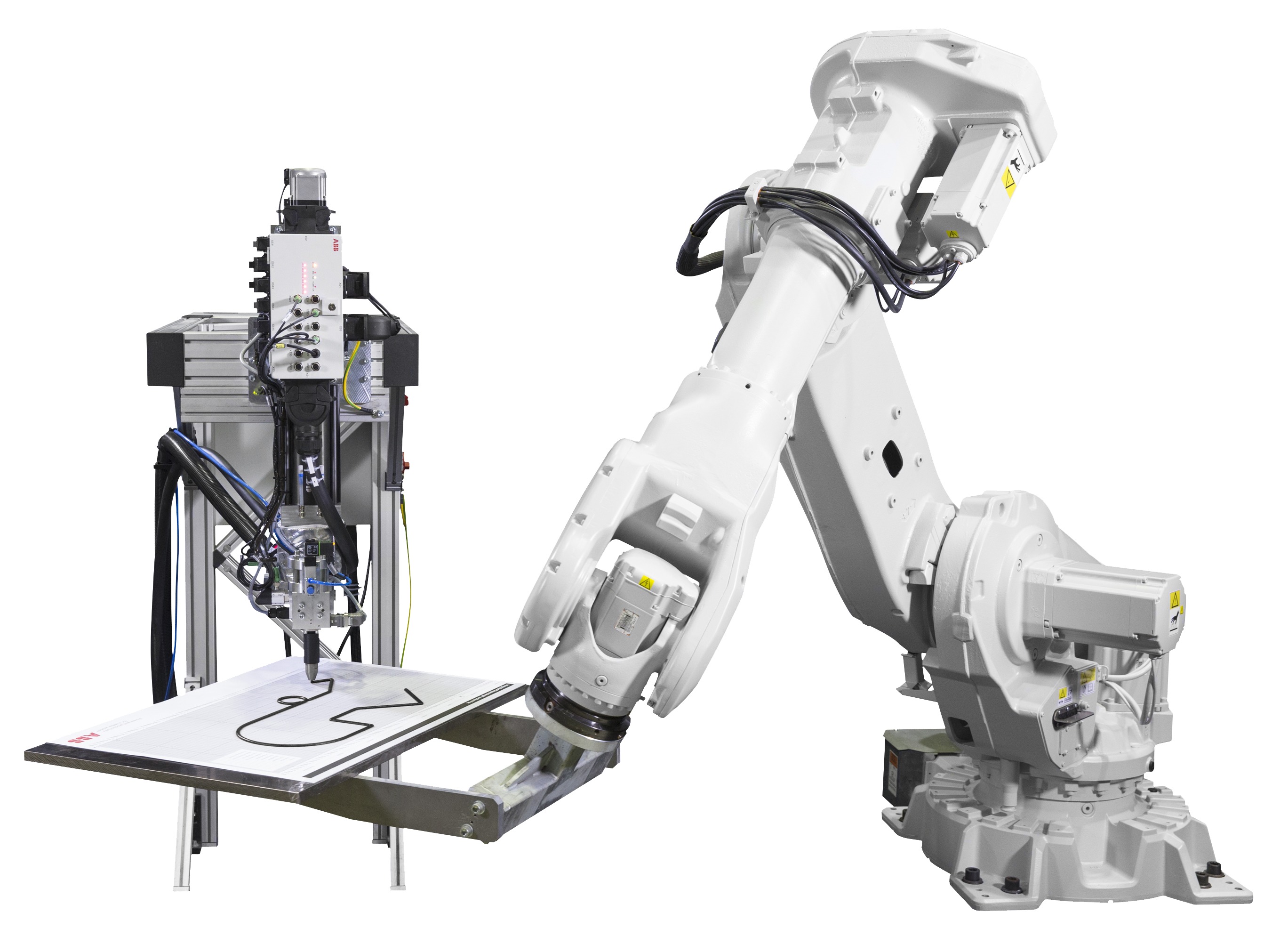 ABB的集成式涂膠功能包(IDFP)集成了整個(gè)膠量控制系統(tǒng)與IRC5機(jī)器人控制器。利用IRC5的軌跡規(guī)劃功能,可實(shí)現(xiàn)精確涂膠,并且,在機(jī)器人速度達(dá)到1000mm/s的情況下,可實(shí)現(xiàn)96ml/s的涂膠工序。