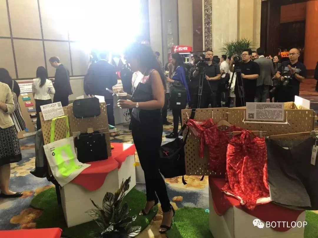 在2018年夏季達沃斯論壇,由BOTTLOOP打造的“8個瓶子再生的T恤”、“14個瓶子再生的手提包”亮相“不瓶凡”展覽。