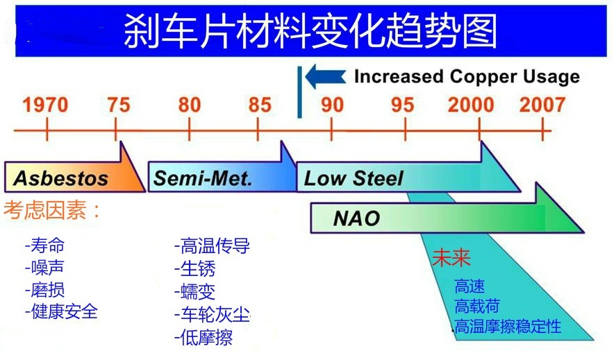 1897年,第一塊應用棉繩做為提高纖維汽車剎車片面世,從而世界著名的Ferodo公司成立。1909年出現第一塊干固石棉基汽車剎車片面世;1968年,第一個半金屬材料基汽車剎車片??????自此,摩擦原材料逐漸向無石棉發展,世界各國逐漸科學研究各種各樣石棉的取代纖維如鋼纖維、夾層玻璃纖維、芳綸纖維纖維、碳纖維等在摩擦原材料上的運用。提高纖維的類型盡管許多,卻沒有一種纖維可以徹底在成本費和性能上替代石棉,因而世界各國近些年的科學研究慢慢從單一纖維轉為了摻雜纖維。