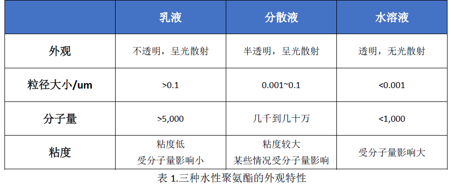 已有人閱讀此文 - -以外觀分類。水性聚氨酯可分為聚氨酯乳液、聚氨酯分散液、聚氨酯水溶液。實際應用最多的是聚氨酯乳液及分散液,其外觀特性如表1所示。