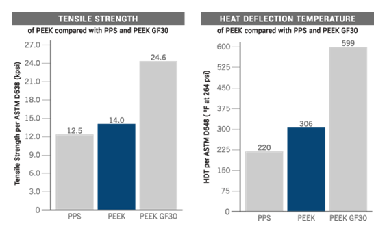 玻璃纖維的添加大大降低了膨脹率,增加了PEEK的彎曲模量。該等級對于需要更大強(qiáng)度,剛度或穩(wěn)定性的結(jié)構(gòu)應(yīng)用特別好 - 特別是在高于300ºF的溫度下。