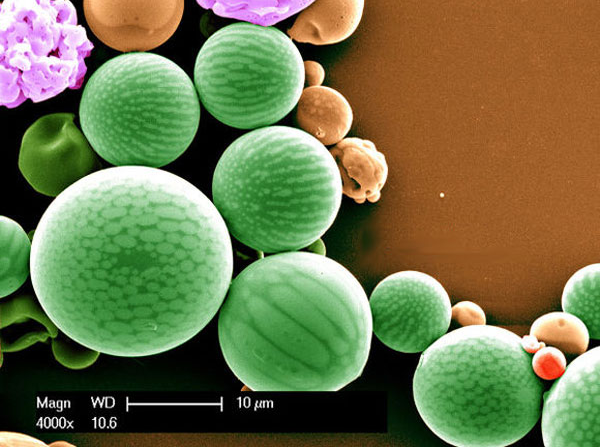 PMMA 自拍照  。自我介紹:超順磁聚甲基丙烯酸甲酯(PMMA)微粒,旁邊的棕色小球是Fe2O3納米晶體,它們自發的聚集到一起。