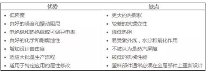 汽車輕量化是現在常常被提及的主題,高溫塑料常常被視為金屬的替代品。圖4總結了高溫塑料相較于金屬的一些優缺點。