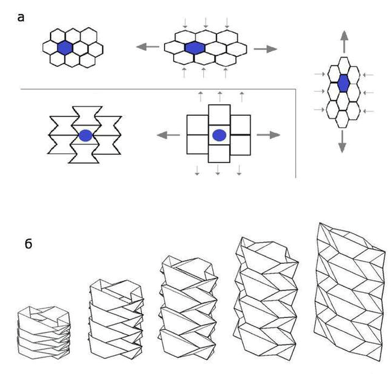 圖a為一般材料和拉脹材料遭受拉申時的情況,由此可見受拉時拉脹材料的伸縮模塊進行,橫著規格擴大;圖b為依據miura-ori標準伸縮出的商品,在弄直時出現拉脹特點。圖片出處:朗道理論物理研究所
