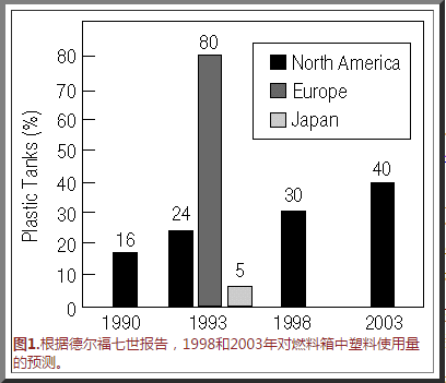 自20世紀(jì)80年代中期以來,汽車制造商已經(jīng)用塑料替代涂層鋼罐。在1993年的模特年份,在北美建造的大約270萬輛汽車和卡車使用了非金屬坦克。這相當(dāng)于1990年的16%。相比之下,歐洲市場使用70-90%的塑料儲罐,而日本市場則使用5%塑料儲罐。