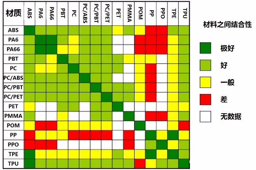 雙色注塑的配對材料必須滿足兩個基本兼容條件,粘合相容和加工過程相容。此外,還必須滿足以下要求:
