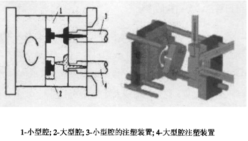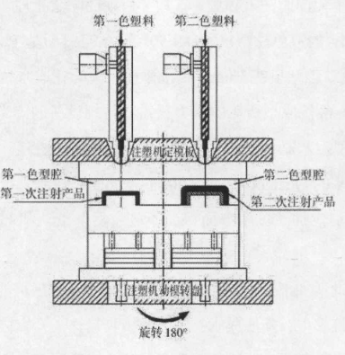 首先通過注成型出雙色制件的第一部分,然后開模,合模,則第一次成型產品轉入大型腔中成為嵌件,注射裝置向大型腔中注射另一種顏色的塑料,將塑料嵌件進行包封,即可成型出雙色制件。與此同時,注射裝置向小型腔中注射第一種塑料,成型出下一塑料嵌件,待制品固化成型后開模,推出雙色塑料件,動模旋轉,閉模,即完成一次注塑成型周期。