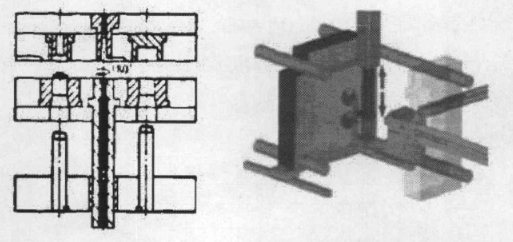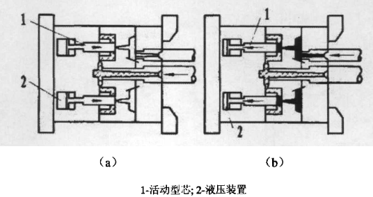 先將一次型芯移至模具型腔部位,合模、注射第一種塑料,然后冷卻開模,安裝在模具一側的傳動裝置帶動一次型芯和二次型芯的滑動,將二次型芯移至型腔部分,合模、注射第二種塑料,冷卻、開模、脫出制品及完成一次成型。型芯滑動用于成型尺寸較大的塑料制件。