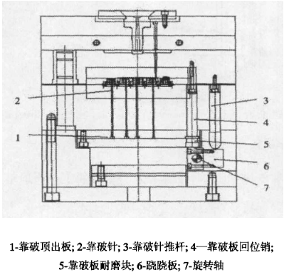 在一次注塑后,模具打開,靠破針在推桿作用下下行,使得蹺蹺板繞旋轉軸旋轉,在蹺蹺板的推動下將靠破頂出板向上頂出,這樣靠破針往上運動,將一次產品封閉區域的邊界處靠破出一個靠破孔。接著進行二次注塑合模時,在靠破板回位銷的作用靠破針往下運動,讓出一個圓形的孔,這樣二次料就能從靠破孔鉆進封閉區域。