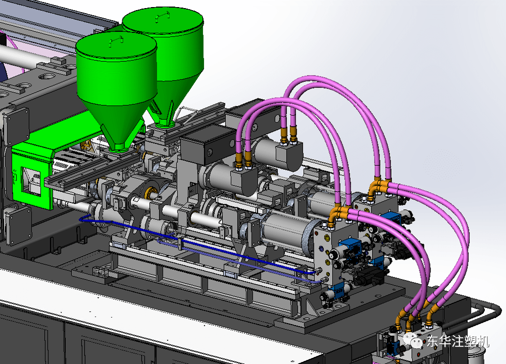 后置式單缸無桿腔射膠結構,油缸密封件數量少,射膠阻力小,提高射膠有用功能效占比,降低射膠壓力,節能減耗;有桿腔環形面積為無桿腔面積的40%以下,在高速射膠的情況下有桿腔排油量小,回油阻力小,油路控制精準。