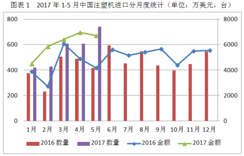 已有人閱讀此文 - -2017年1-5月,中國塑料機(jī)進(jìn)口2802臺,同比增長率39.0%,進(jìn)口金額為30420萬美元,環(huán)比升高39.9%;出口10251臺,同比減少10.3%;出口金額為44205萬美元,環(huán)比升高12.1%。
