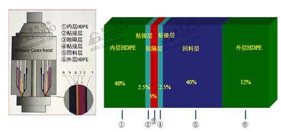 現階段常見的雙層塑料燃油箱一般為六層,如圖所顯示其構造是:從內到外分成里層HDPE 、粘接層、隔絕層、粘接層、再生料層、表層HDPE。日益提高的環境保護化和汽車輕量化規定,使塑料燃油箱的要求持續提升。除此之外,雙層共擠技術性的發展,使塑料燃油箱的特性優點日益突顯。