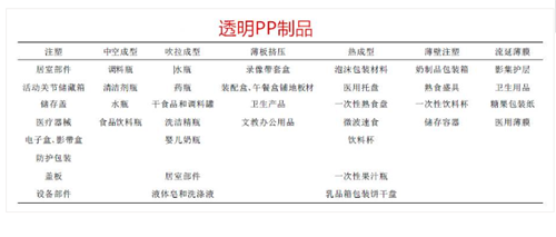 透明PP原材料關鍵運用于注入成形,空心成形,熱成形及其注-拉-吹成形等行業。從主要用途上講,透明PP原材料已普遍地運用于日用具及其微波爐加熱廚具等家用品層面;塑料包裝制品和注射針等各種各樣醫用器材則是透明PP原材料在藥業行業的有關運用,該行業具備十分大的發展趨勢室內空間。除此之外,厚壁型注入產品是透明PP原材料目前的運用發展趨勢,該產品不僅對制做模貝的規范規定非常嚴苛,并且必須原材料樹脂的流動性性能也很好,因而該行業會發展趨勢為透明PP原材料運用的新突破點。其實際運用范疇見下表。