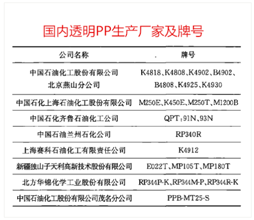 中國于二十世紀90年代逐漸科學研究和開發設計透明PP樹脂,發展相對性海外比較晚。下表為中國普遍的透明PP專用型料型號,殊不知,中國在透明PP產品的類型和銷售市場消耗量及其有關生產工藝的科學研究和開發設計層面與海外企業仍具備很大的差別。