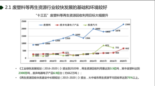 除開大宗商品工業(yè)固廢開發(fā)利用量、綜合性使用率,十大類再生資源收購總產(chǎn)量、收購總價(jià)值持續(xù)的提升、提升之外,“十三五”廢塑料等再生資源回收再利用總體目標(biāo)也在大幅度提高。