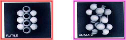 由圖中還可以形象化見到左圖的金紅石型中二氧化鈦分子結構排序較為密不可分,因此具備很大的可靠性和密度,因而具備較高的折光率和和相對介電常數及較低的導熱性。但銳鈦型在915℃上下也可以變化呈金紅石型。