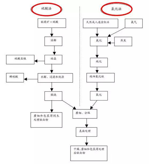 鈦白粉的生產制造方式 :氯化法和鹽酸法。伴隨著中國環境保護呼吁高聲,相對性較為環境保護的氯化法是鈦白工業生產的整體發展趨向;