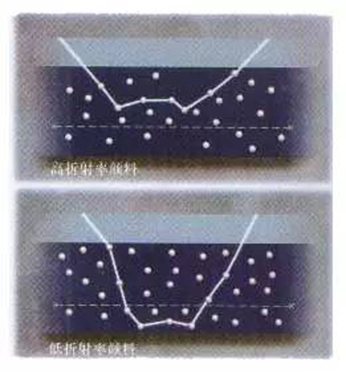 折光率越高,就會越不全透明,就是油漆附著力越強。由于在帶有高折光率顏料的漆層中光源比在帶有低折光率顏料的漆層中彎折較多,光源更難通過這層塑料薄膜。