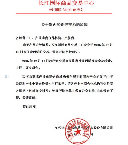 12月14日,江蘇省長江國際產品交易中心公布有關聚丙烯中止交易的通告,12月16日起終止聚丙烯交易,14日起交易合同所有強制平倉。該通告原文以下: