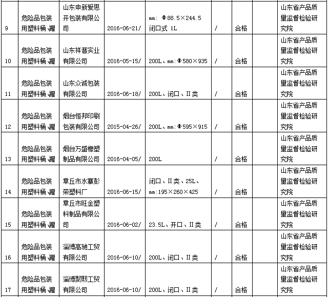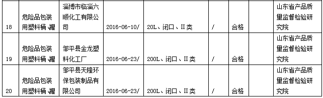 2016年第三一季度,山東質監局機構進行了危險品包裝用塑料桶、罐產品品質省監管抽查。此次共抽查了我省18家公司生產制造的20批號危險品包裝用塑料桶、罐商品,均合乎有關規范的要求。