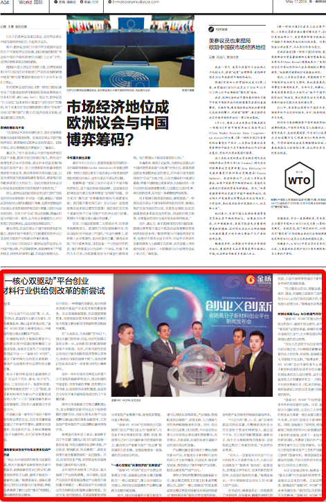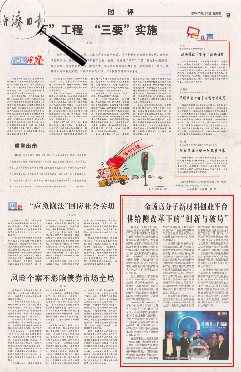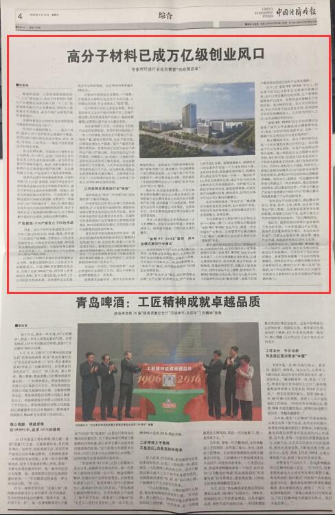 2016年4月中下旬,《中國經濟時報》,半版刊登《高分子材料已成萬億級創業風口,專家呼吁行業急需“供給側改革”》,讓在一切眾生十分生疏的高分子材料行業進到大家視線,引起中國諸多媒體的關心。