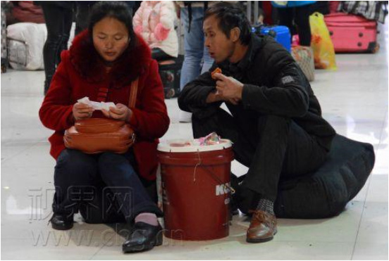 17日中午,夫妻倆從湖南省耒(lei)陽坐火車返回重慶市,為了更好地省下車費,她們選購了最劃算的站票。整整的20個鐘頭的站票時間里,這只塑料桶便是兩個人的挪動驛站。