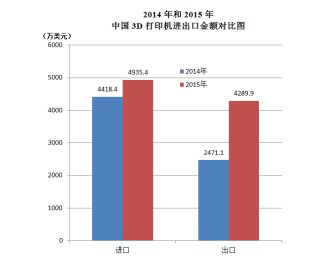 2015年中國進口三維打印機6600臺,同比增長率6.1%;進口金額為4935.4萬美金,同比增長率11.7%。出口三維打印機15.46萬部,環比大幅度提高187.6%;出口金額為4289.9萬美金,環比大幅度提高73.6%。三維打印機貿易赤字由2014年的1722萬美金縮窄至645.5萬美元。
