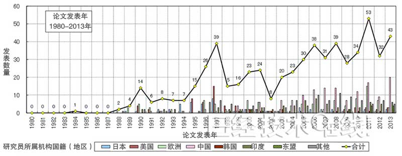 按研究者隸屬組織的國藉統計分析的畢業論文數量變化和畢業論文數量占比(發表論文年:1980~2013年)