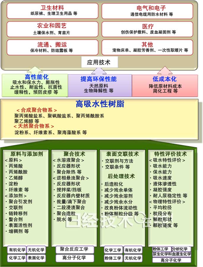 圖是高吸水性樹脂的技術性一覽。關鍵調研的技術領域包含:(1)在做為樹脂原材料的化學物質和樹脂構成物中加上的化學物質;(2)匯聚方式;(3)表層化學交聯方式;(4)后處理工藝方式(干躁方式等);(5)特點點評技術性;(6)應用技術。