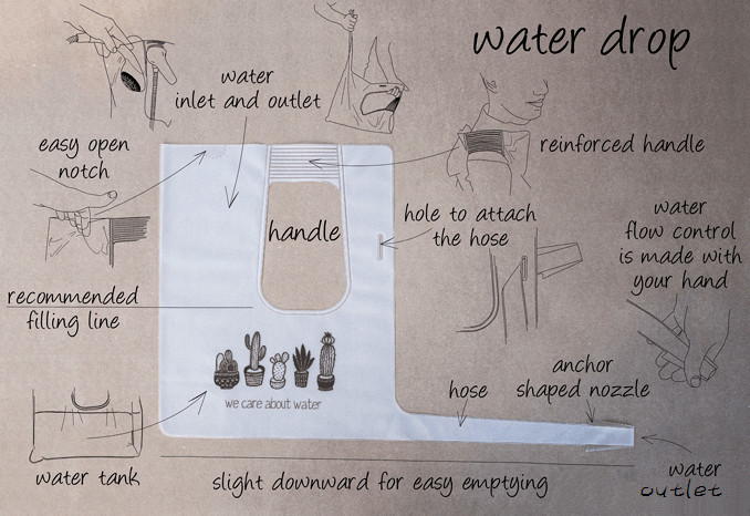 WaterDrop由可回收利用的熱固性聚氨酯材料(TPU)原材料打造出,因而延展性和延展性強(qiáng)力,擔(dān)心水放的太多而崩裂,稱之為便是一款兜里里的茶壺。它被揍導(dǎo)致一個(gè)手拎袋的方式,那樣水的個(gè)人收藏、存儲(chǔ)、帶上就越來越十分便捷。大家可以用袋子里的水用來給花澆水、沖廁所等,如下圖: