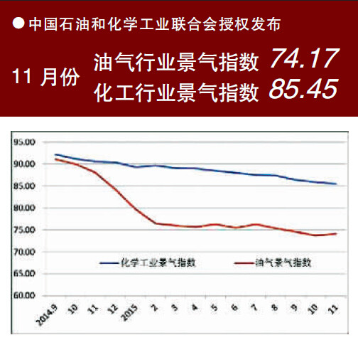 最新數據顯示信息,2015年11月份,在我國油氣領域景氣指數止跌回升,化工行業景氣指數再次下降。油氣領域景氣指數為74.17(2004年=100,相同),比上個月升高0.49點,但依然處在明顯不景氣水準;化工行業景氣指數為85.45,比上個月下降0.48點,持續九個月下降,再次處在較不景氣水準。兩大景氣指數綜合性說明,當今原油和化工行業總體運作再次呈底位劣勢布局。