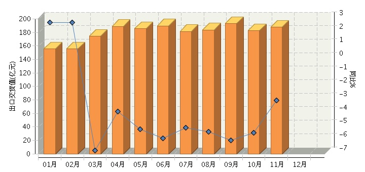 一月~11月,全國各地塑料行業總計進行出口交貨值1,989.31億人民幣,同比增長率-3.54%。