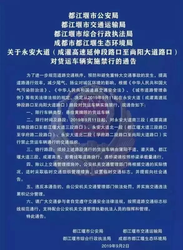 四川省:2019年9月13日0時至2019年9月15日24時,全省高速公路禁止危險化學品運輸車輛通行。9月11日起,都江堰永安大道北段大型貨車禁行。