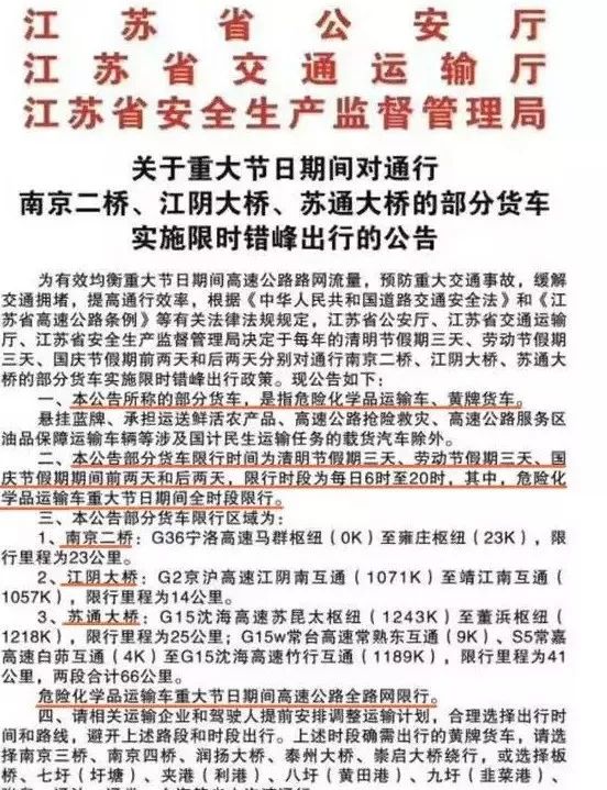 江蘇省:2019年9月12日22時至2019年9月16日6時,全省高速公路禁止危險化學品運輸車輛通行。